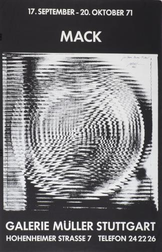 Heinz Mack Mack - Galerie Müller Stuttgart1971 /1992 Katalog-Nr.: 500/O405/Ma 120 € # Plakat: Serigraphie in Weiß / schwarzer, leichter Tonkarton, oben rechts signiert, datiert "1992" und mit einer eigenhändigen Widmung des Künstlers versehen; 98 x 64,5 cm. Plakat zur Ausstellung des Künstlers in der Galerie Müller, Stuttgart, 1971, vom Künstler eigenhändig einem bekannten rheinischen Kunstkenner gewidmet. Im oberen Randbereich eingerissen und bugig, die Darstellung davon nicht betroffen. Kunstwerk zu Favoriten hinzufügen In den Warenkorb |