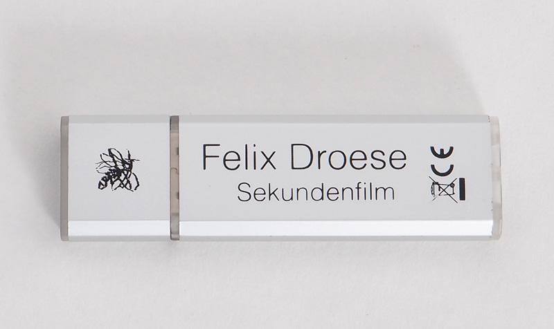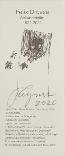Multiple: Mp4v Video File auf Intenso Datenstick, von 50 Sekunden Dauer, in Kartonbox mit Einlegeblatt, auf dem Einlegeblatt s/w-Serigraphie nach einer Zeichnung des Künstlers + Impressum, Auflage 29 Exemplare, auf der Box signiert und datiert, dort typographisch gestaltet, auf dem Einlegeblatt zusätzlich signiert und datiert; Format der Box: 16 x 7,5 x 3,8 cm. I-Phone Aufnahme von Gretel Droese, technische Bearbeitung Marc Gottschalk, graphische Gestaltung b2, Solingen. Erschienen in der Edition Artax Kunsthandel, Düsseldorf, 2021.